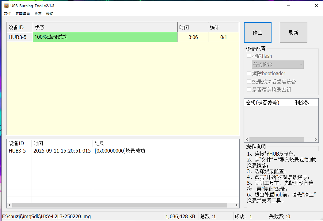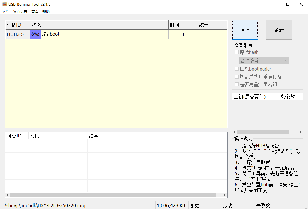 6. 先点击(Usb_Burnning_Tools)右上角的 开始,将双公头 usb 线一头电脑 usb 口,另一头先“虚接”盒子接近网口的 usb 口(这个虚接的意思就是 usb 线接口不插入板子的 usb 口,而是准备插入的状态),然后板子快速接电源再接上 usb 口(先把 usb 线放在板子口附近半接触,然后接通电源后快速接上板子的 usb 口),这时候可以看到“连接成功”(如果没有成功,重试拔插几次 usb 和电源线)